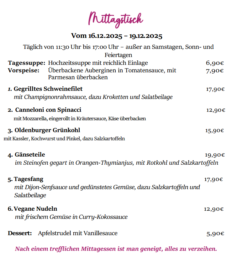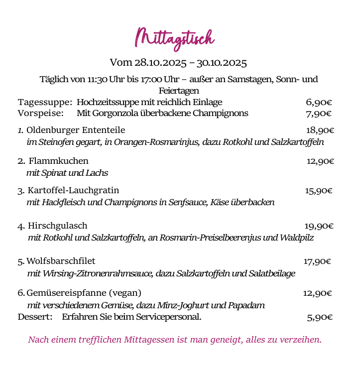 genießen Sie unseren Mittagstisch von 11:30 bis 17:00 Uhr jeden Dienstag bis Freitag. (Außer an Samstagen, Sonn- und Feiertagen)